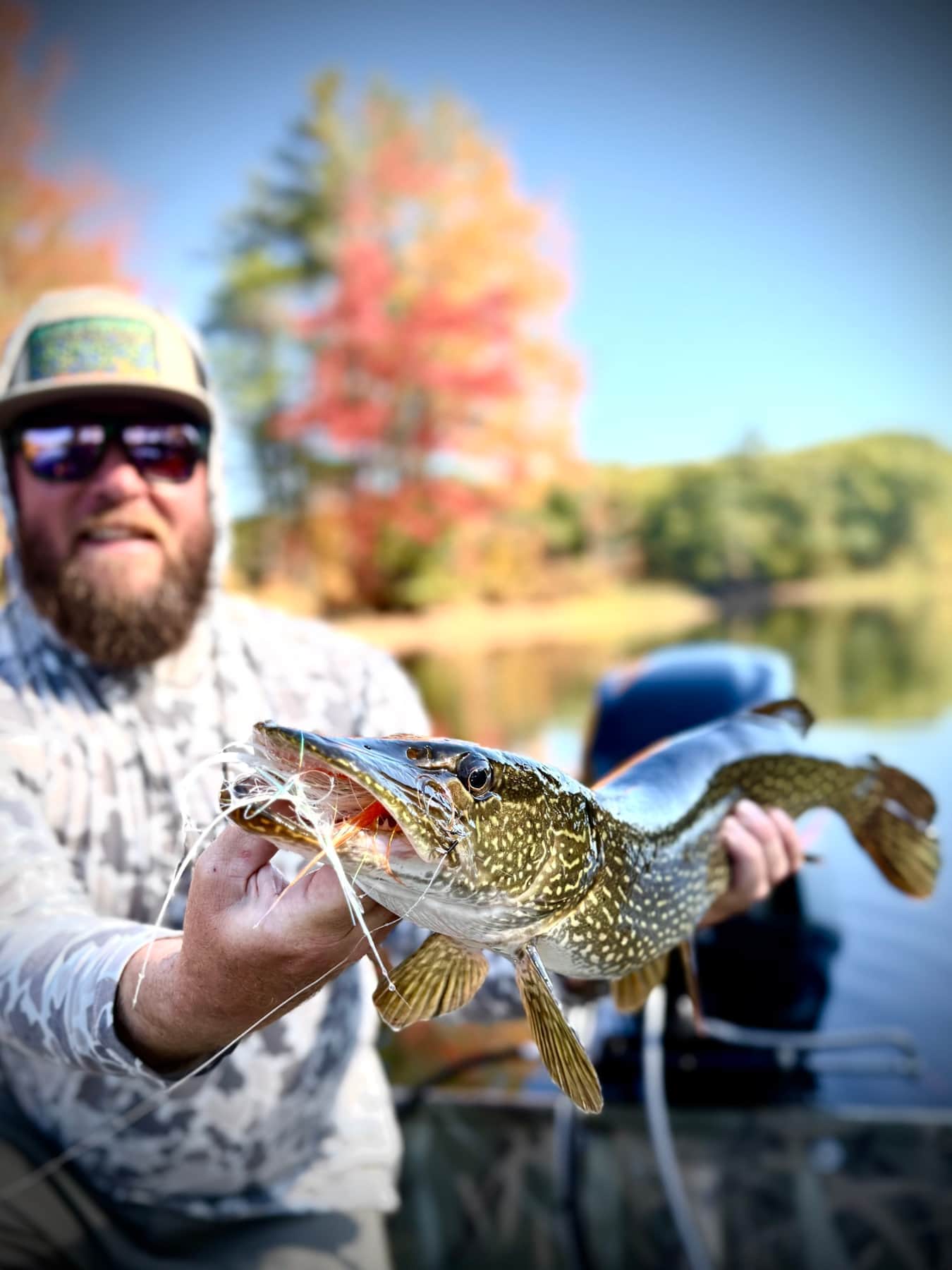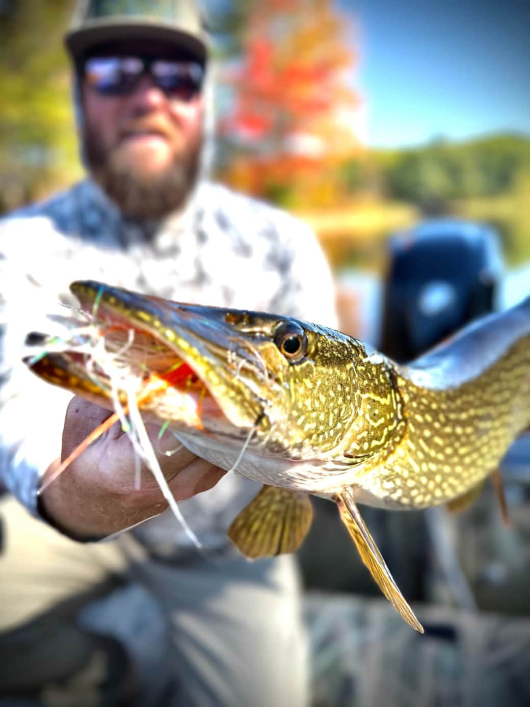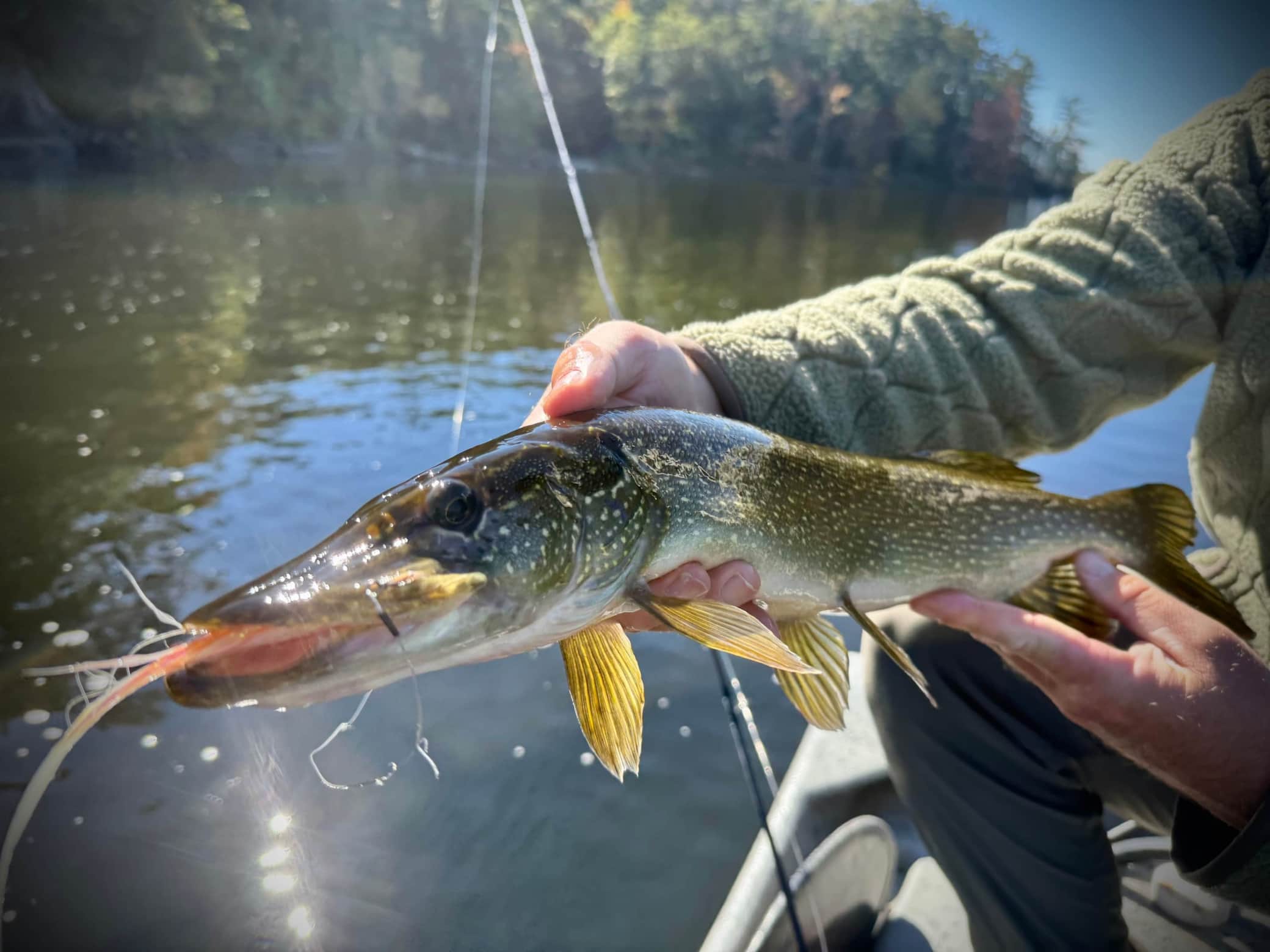 We target pike using 8-11 weight rods. Flies vary from easy to cast 5” flies to large 10” flies. We access the many river locations we guide with our Crestliner Retreiver 1660 FCC Jet Boat! This allows for flexibility where we fish, when we fish, when we get off the water, no need for a shuttle, and is a great platform to cast and see these large beast follow or ambush your fly!